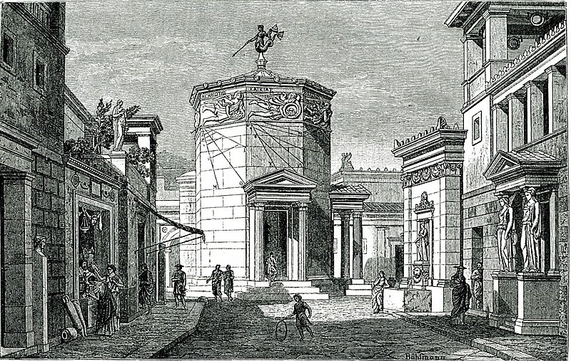 Αρχαίοι συγγραφείς αναφέρουν τον Ανδρόνικο από τη μακεδονική Κύρρο ως αρχιτέκτονα. Πρόσφατες έρευνες το χρονολογούν στο 120-100 π.Χ., με ενδεχόμενους δωρητές τους Πτολεμαίους της Αιγύπτου, καθώς υπήρξαν πάτρωνες της Αθήνας καθ’ όλη τη διάρκεια του 2ου αι. π.Χ., και υποστηρικτές των επιστημονικών καινοτομιών με κέντρο την Αλεξάνδρεια.